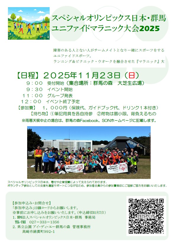 障害のある人とない人がチームメイトとなり一緒にスポーツをするユニファイドスポーツ。ランニング&ピクニック・ウォークを融合させた「マラニック」大会。今年も開催します♪共に楽しみましょう♪